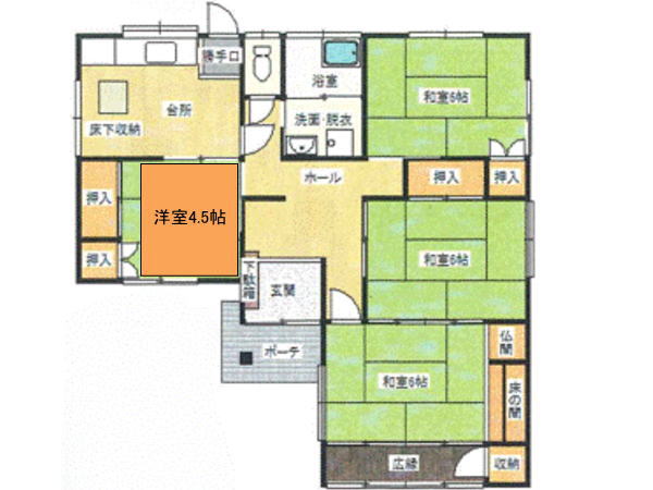 洋4.5帖、和6帖×3、台所6帖、風呂、w.c.